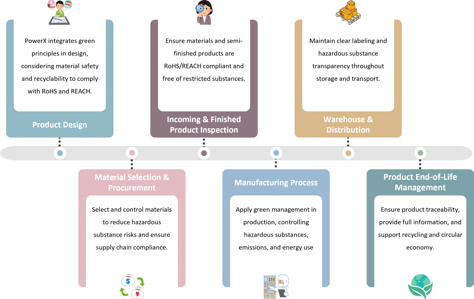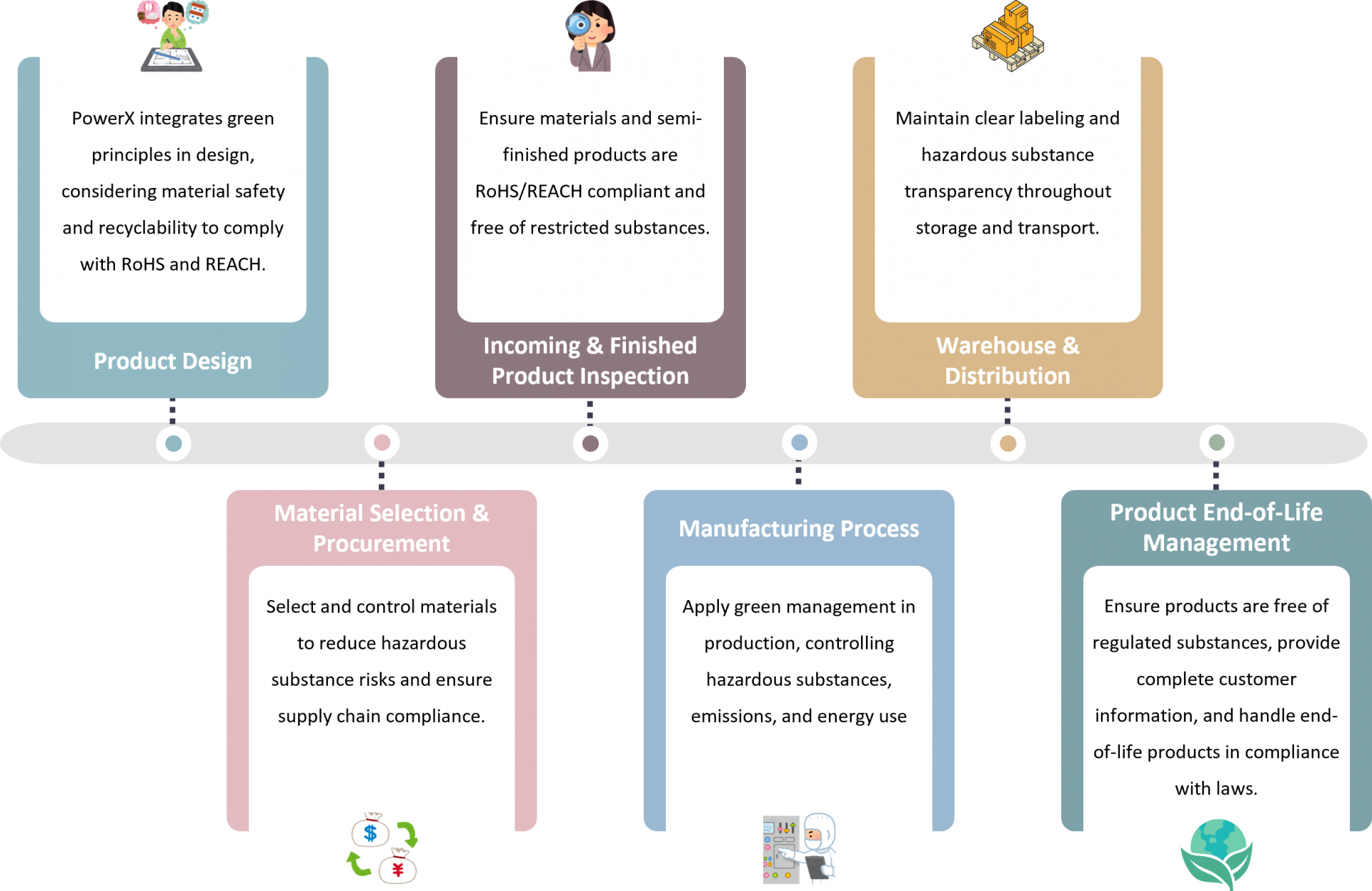 PowerX has established the "S-027 PowerX Environmental Restricted/Hazardous Substances Work Instruction" to comply with international regulations and meet customer requirements.