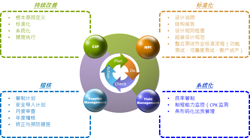 通过落实所制定的作业标准、监控产品良率、执行内外部审核活动、推动持续改善达成客户满意等绩效方法,确保并落实质量管理体系之有效实施。