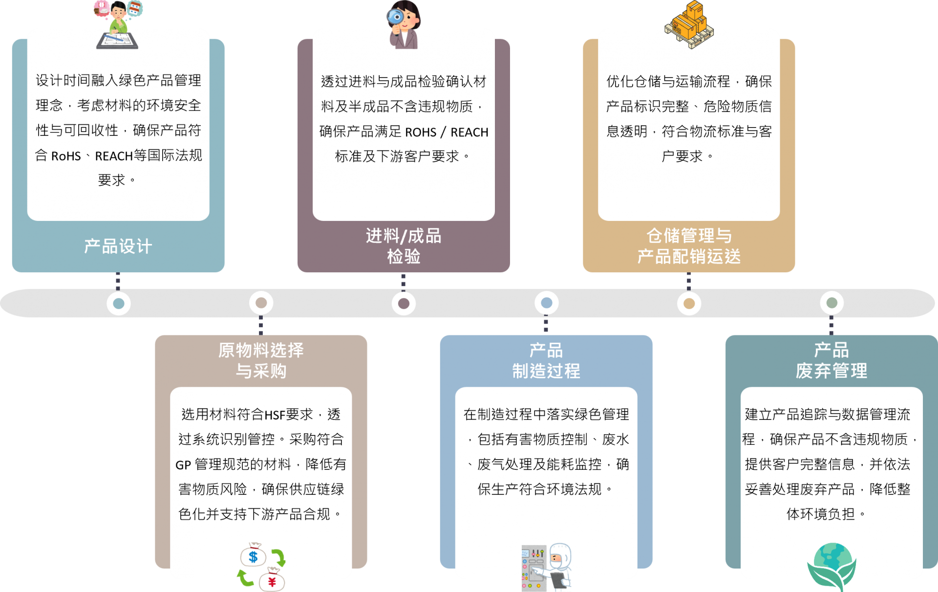 本公司依据国际法规及客户要求,制定《S-027 能创环境禁(限)用物质作业指导书》,通过定期审核供应商检测报告,持续关注各国环保趋势与议题,及时掌握客户需求,积极履行社会责任,确保有害物质管理系统有效运行。